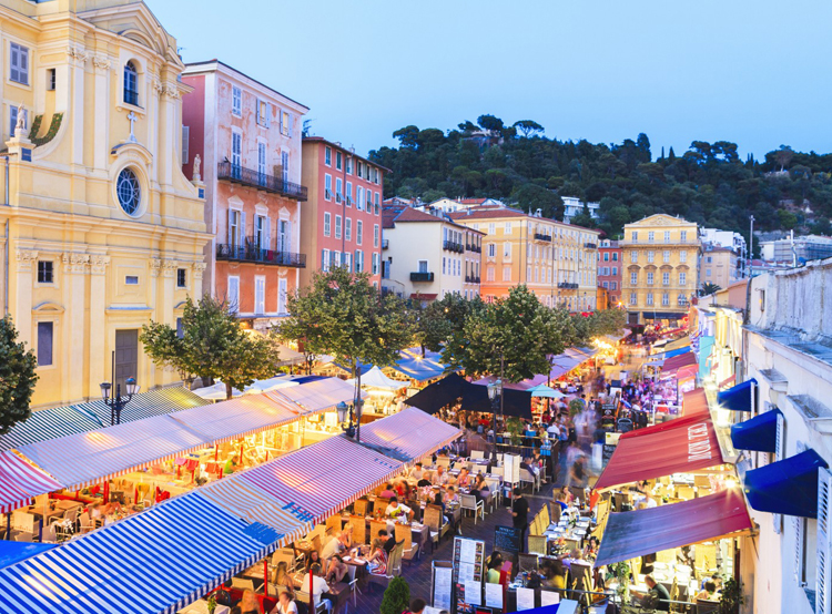 In Nice, stroll through Vieille Ville, the Old Town. Enjoy a snack of socca, a round pancake made with chickpea flour that's sold steaming hot by street vendors. Wander past the stalls at the colorful outdoor market in cours Saleya, then head for the promenade des Anglais, the wide boulevard along the waterfront.