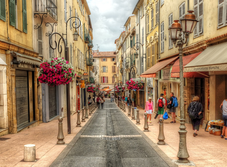 In Nice, stroll through Vieille Ville, the Old Town. Enjoy a snack of socca, a round pancake made with chickpea flour that's sold steaming hot by street vendors. Wander past the stalls at the colorful outdoor market in cours Saleya, then head for the promenade des Anglais, the wide boulevard along the waterfront.
